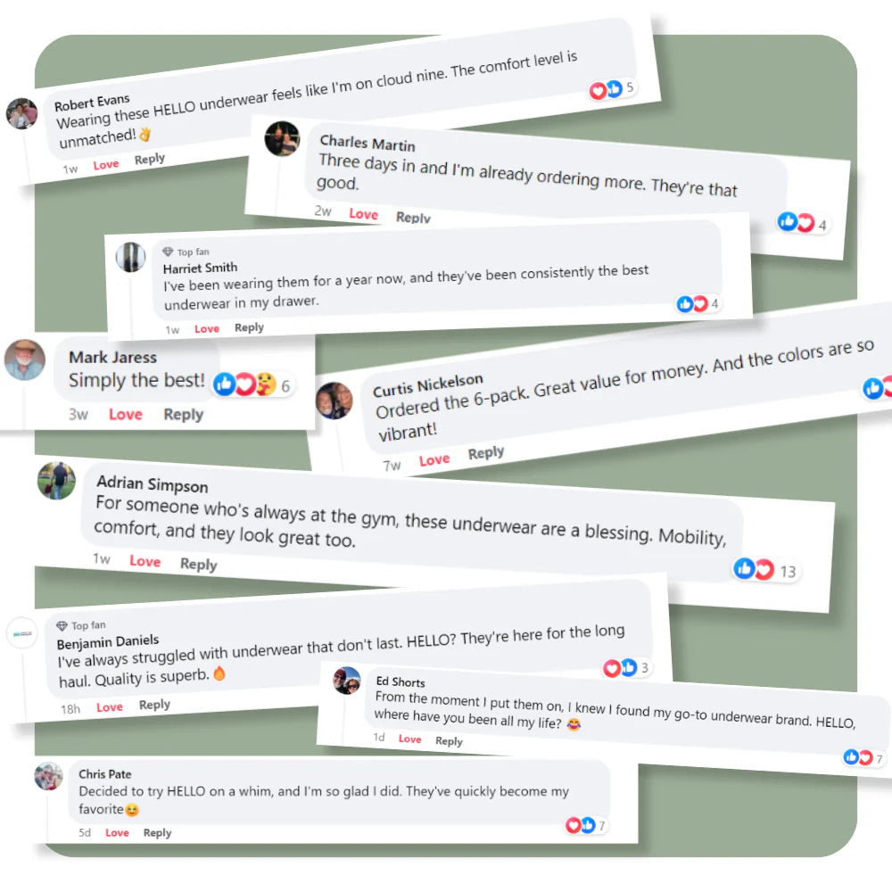 Schließen Sie sich Tausenden zufriedener Kunden an und testen Sie HELLO Unterwäsche selbst. Es geht nicht nur darum, etwas Neues zu tragen – es geht darum, ein völlig neues Maß an Komfort und Selbstbewusstsein zu erleben. Unsere einzigartige Stoffmischung ist unglaublich weich, passt sich Ihrem Körper an und gibt Ihnen Bewegungsfreiheit und freie Atmung. Probieren Sie es aus und überzeugen Sie sich selbst, warum HELLO mehr ist als nur Unterwäsche – es ist ein einfaches Upgrade für Ihren Alltagskomfort, dem so viele vertrauen, die den Wechsel vollzogen haben.